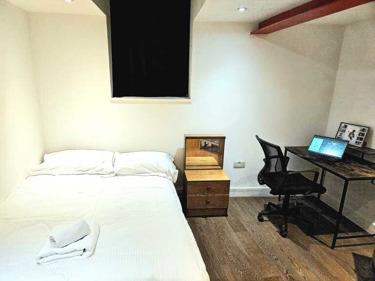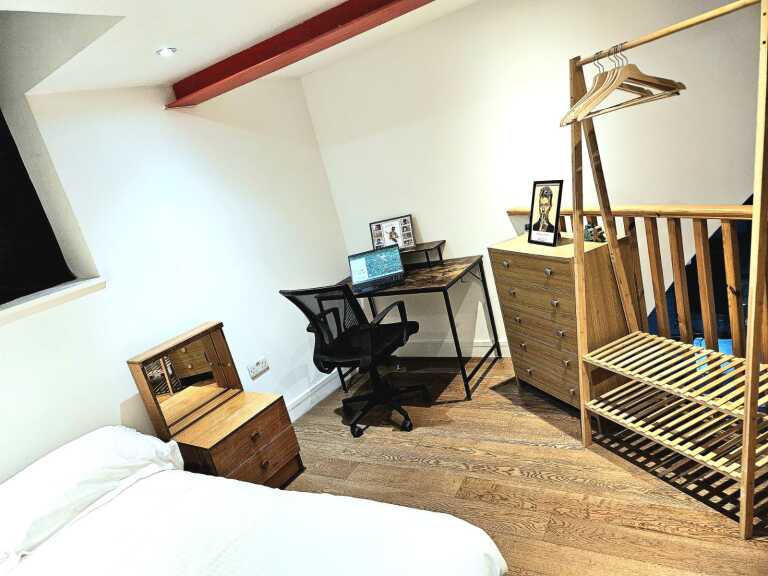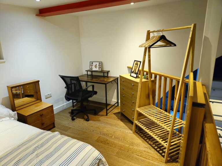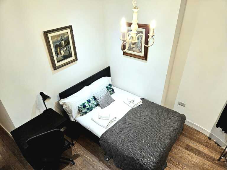 The flat is in a historic building recently refurbished and our flat has lots of space! There are two bedrooms, one historic one in the "beak" of the building overseeing the street and the station! Another one with working station, plus a mezanine as a bedroom, all of them have double beds!!